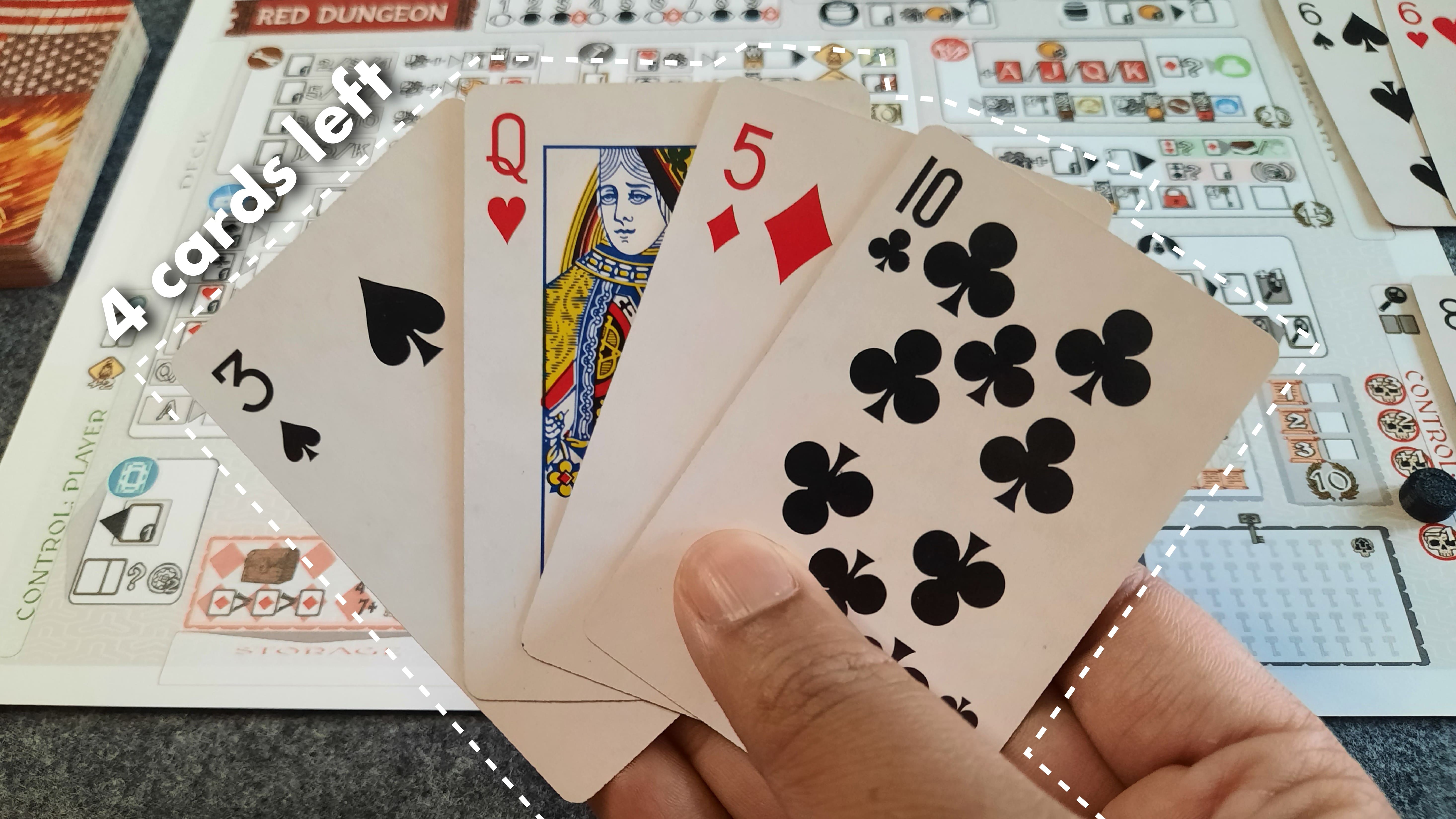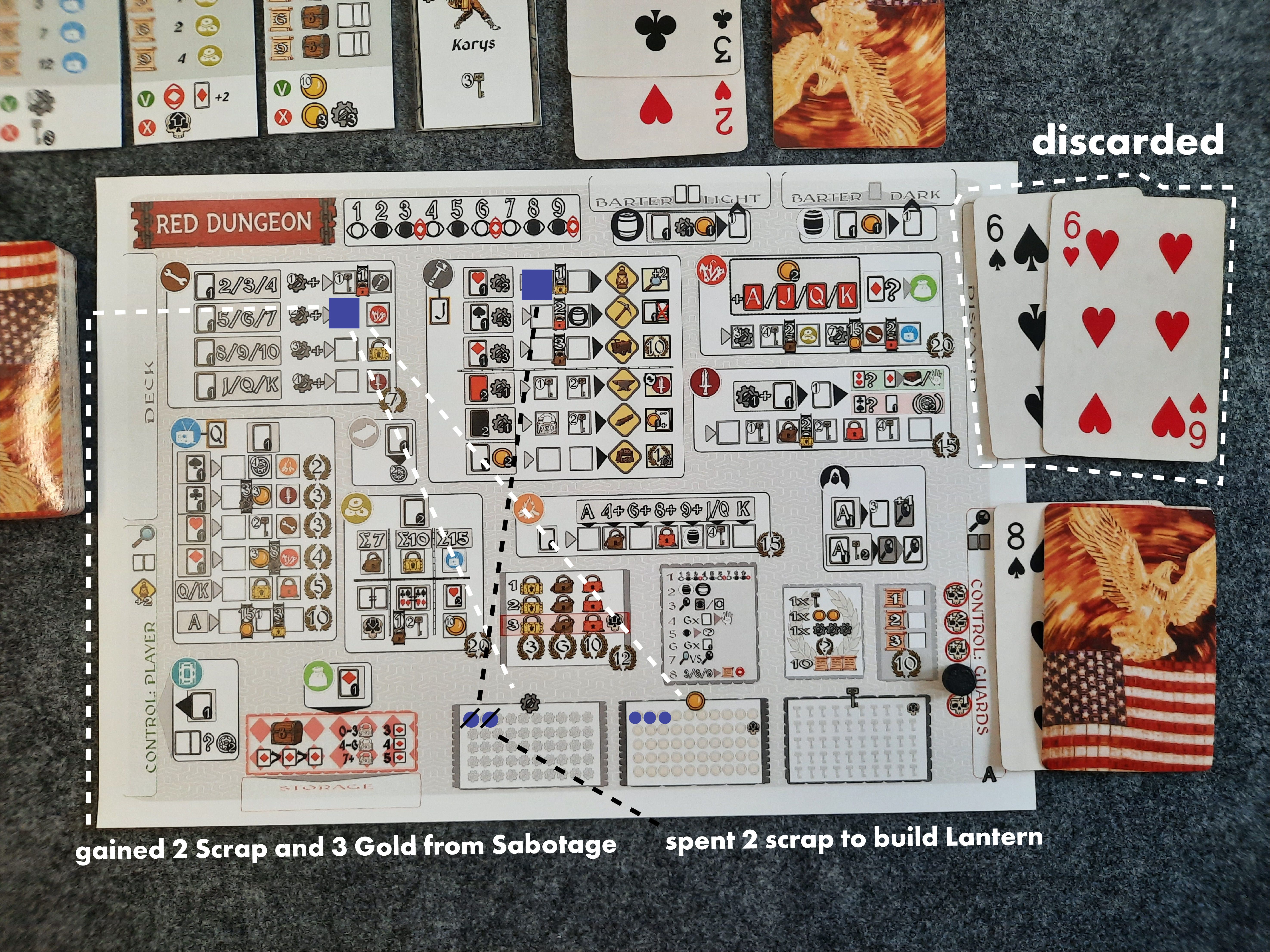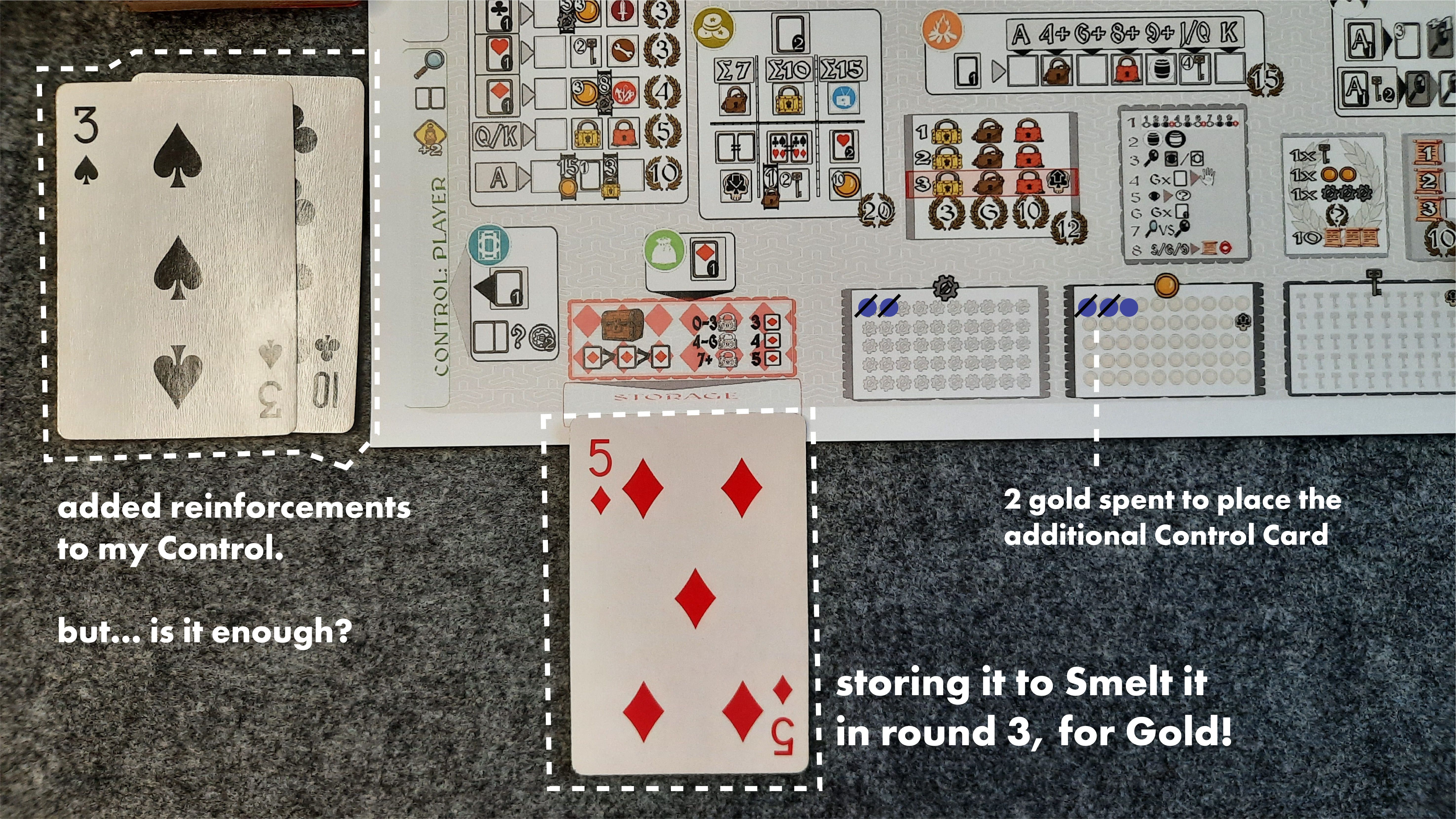 The 5 ♦ goes into Storage. I’ll smelt it at the end of Round 3 and turn it into Gold. Future me will thank present me.