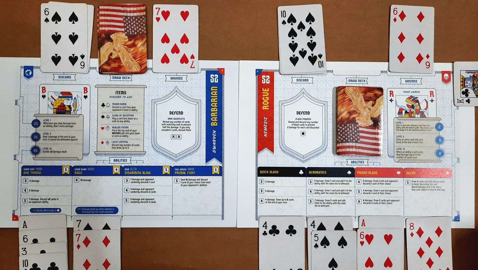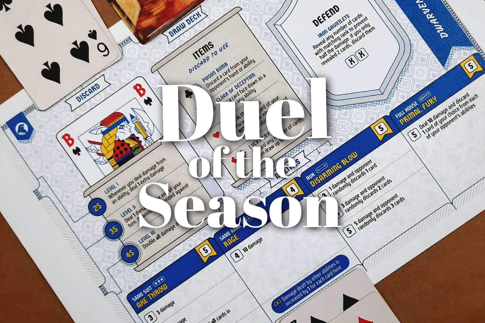 As the name suggests, it’s a dueling game at its core, so it's fast, strategic, and quite packed for a game that uses nothing more than two decks of cards and hero sheets.