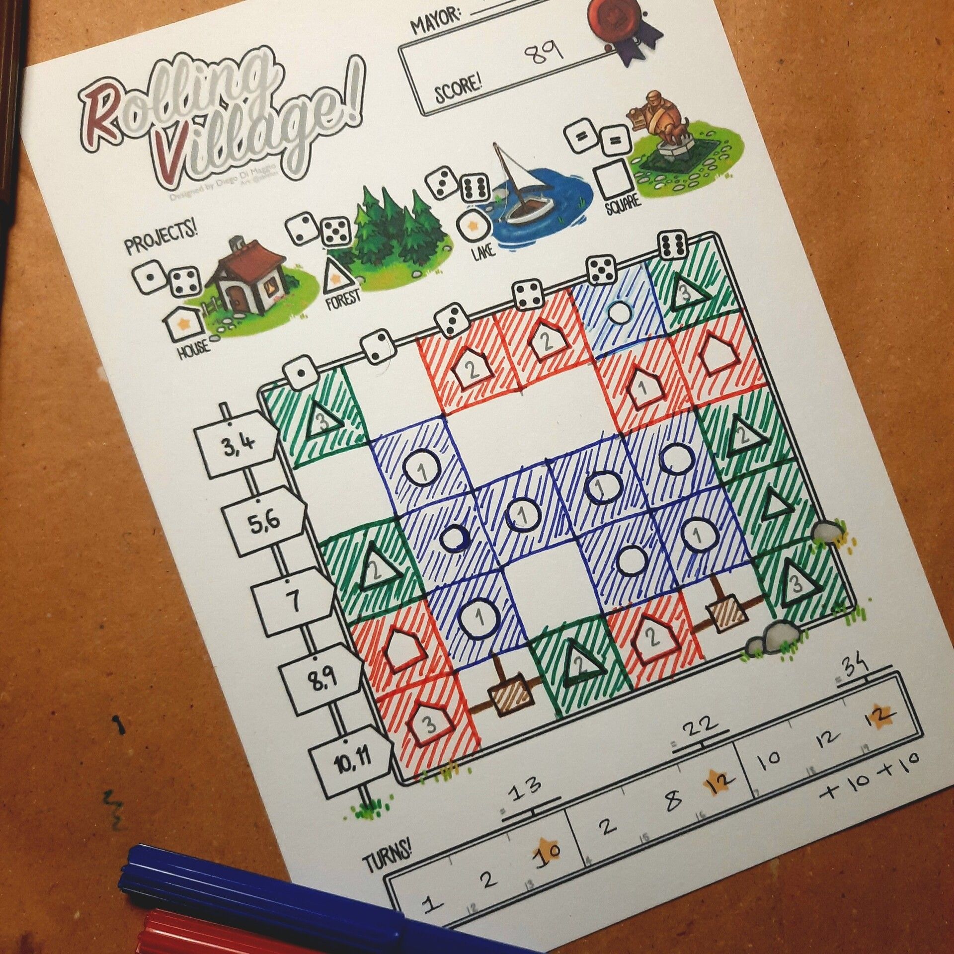 Rolling Village is a free roll-and-write designed by Diego Di Maggio, the creator of Lantern, a game I keep coming back to. In Rolling Village, you shape your village by building (drawing) houses, lakes, forests, and town squares, with the dice and your own choices steering the way. Print a sheet, grab a pair of dice, a pen, and you’re good to go.